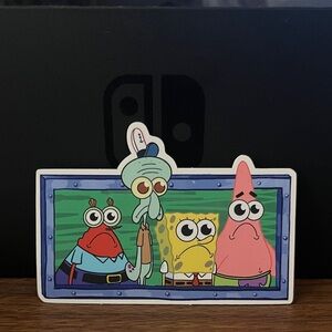 Colorful SpongeBob SquarePants sticker featuring SpongeBob, Patrick, Squidward, and Mr. Krabs. Perfect for fans of the show.