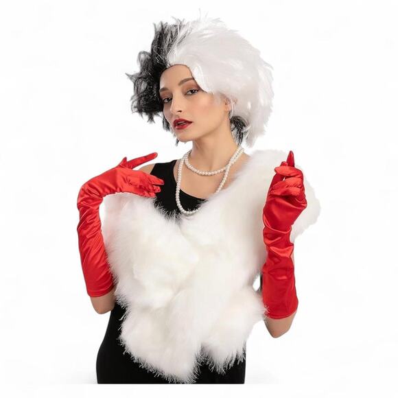 Unleash your inner villain with the Spooktacular Creations Villainous Lady Costume Set. This set includes a striking black and white wig, a chic cigarette holder, a pearl necklace, and bold long red gloves, perfect for Halloween or themed parties.