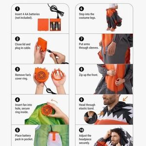 NOTICE: Use the Pocket Located Inside the Costume’s Legs to Safely Store the Battery Pack. DO NOT put the Battery Pack in Your Own Pocket Otherwise, It Gets Overheated. Adjust the Direction of the Fan and Tighten the Drawstrings for the Best Inflating Performance.