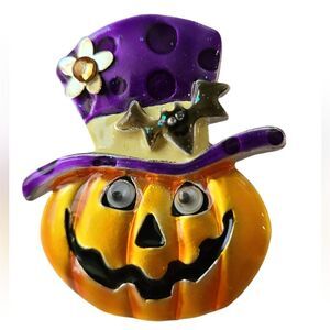 Get into the Halloween spirit with this adorable pumpkin brooch from AJMG. This whimsical piece features a cheerful jack-o'-lantern face topped with a purple polka-dot hat adorned with a flower and a bat. The brooch is sure to add a touch of spooky fun to any outfit.