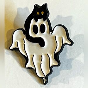 Elevate your style with this spooky ghost and cat brooch. Featuring a playful design in classic black and white, it's a perfect accessory for any occasion.