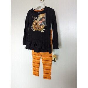 This brand new Spooky Night girls' outfit is perfect for Halloween festivities. The black top features a sparkly sequin pumpkin and a playful ruffled hem. The matching orange and black striped leggings complete the festive look. Size XS (4). See photos for details.