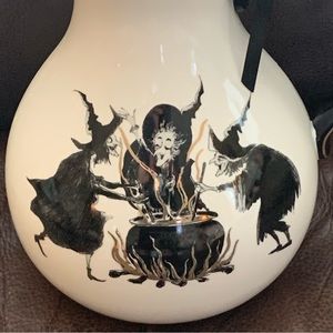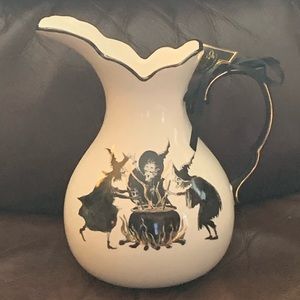 This is a beautiful 88oz ceramic pitcher from the Potter’s Studio Spooky Night Collection. Gorgeous white color with black and gold trim and incredible double sided Halloween themed design. One side features three witches standing over a cauldron. The other side features a spooky raven standing on a Jack O’Lantern pumpkin. This hard to find piece is brand new with tag and in excellent condition. Comes from a smoke free hone. This item is heavy and cannot be bundled in the same box with another item.