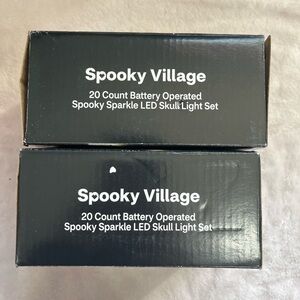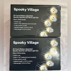 Spooky Sparkle LED Skull Light Set 2 Boxes White Bulbs 4.75 FT Lighted Length for Each Box. 5.75 FT Total Length for Each Box. Total Lighted Length of Both Boxes 9.5 FT. Total Length of Both Boxes 11.5 FT. Each Box Includes 20 Bulbs. 40 Total Bulbs for Both Boxes. NWT. Indoor Use. Uses 3 AA Batteries (Not Included).