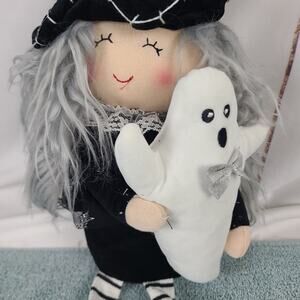 This spooky witch and ghost decor figure is a 24" plush Halloween collectible with a weighted bottom for stability. Perfect for adding a touch of Halloween charm to your decor, this witch figurine is part of a Halloween collection and features a spooky witch as its subject. The figure is not signed, and is sure to delight Halloween enthusiasts looking to add a touch of whimsy to their seasonal decor.