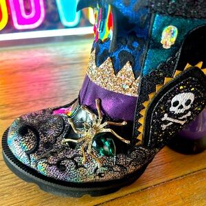 Irregular Choice boots in a size 9, new with box, giant jeweled spider detail and gorgeous colors! Spooky!