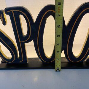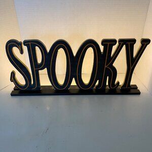 An LED-lit Halloween sign with a sturdy metal design and a black base. It adds charm and light to seasonal decorations.
