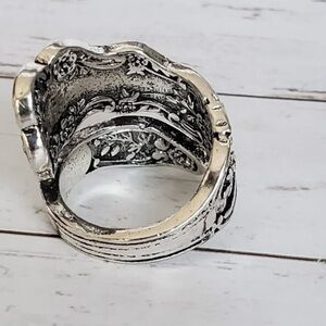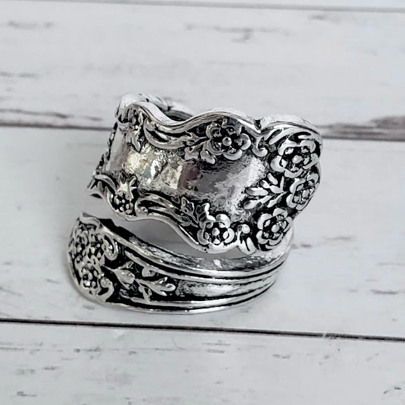 Pretty spoon wrap ring in antique silver tone over alloy. Variety of sizes