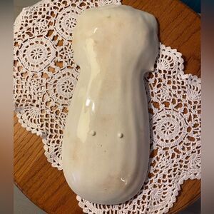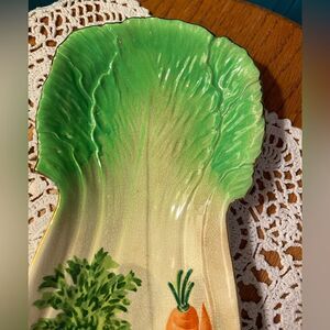 Lovely little vintage spoon rest for your stove beside him has some nice crackling in a Janet. If you’re looking for that vintage appeal for your kitchen is shaped like a celery stock and has appliqués of vegetables on the front of it.