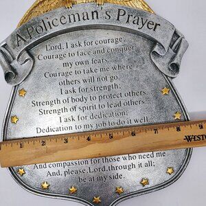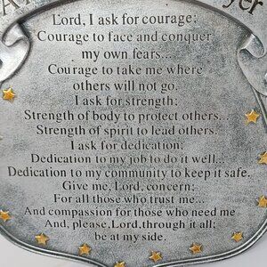 This plaque features "A Policeman's Prayer" on a shield-shaped design, adorned with a golden eagle. Crafted by Spoontiques, it is a heavy ceramic/ resin. It serves as a meaningful decor piece, embodying themes of courage, strength, and dedication. Ideal for law enforcement officers or supporters, it offers a heartfelt tribute.