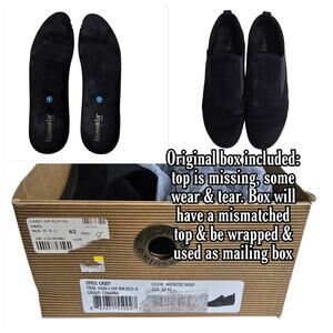 Solid black synthetic micro suede upper. Pull on style w/ stretch elastic gores on sides. Removable cushioned comfort insole, round toe. Issues noted in photos. Good preowned condition, overall. Size EU 42, US 11 - 11.5 by Bussola. Style: Coimbra Casey