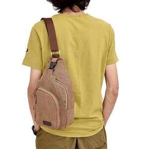 In new like condition. Sport pack chestpack/backpack brown/gray canvas material. Has a lot of storage for a smaller bag.