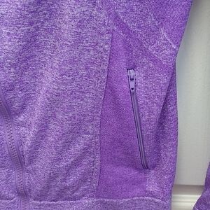 EUC purple hooded zippered compression jacket with thumb holes, 2 side zippered pockets, and 2 inside slip pockets.