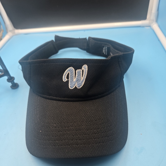 black sport sun visor with a white and blue embroidered 'W' logo.
