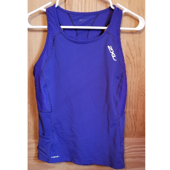 Blue sports tank top with built in sports bra. It has been use a few time and well taken care of. Smoke free home.
