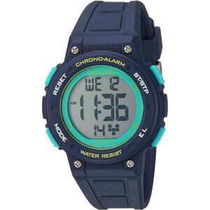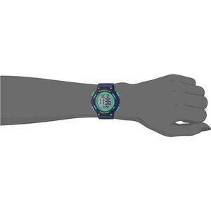 *37.5mm navy blue resin case with teal and lime green accents; LCD display with day, date, time and seconds