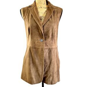 Elevate your wardrobe with this timeless SportMax Code women's vest. Crafted from a luxurious suede and wool combination, this mid-length vest features a solid brown color and a collared neckline with button closure. The sleeveless design and all-season features make it perfect for layering in winter, spring, or summer.
