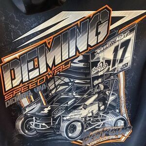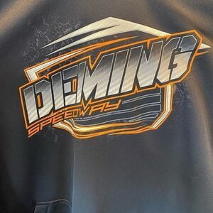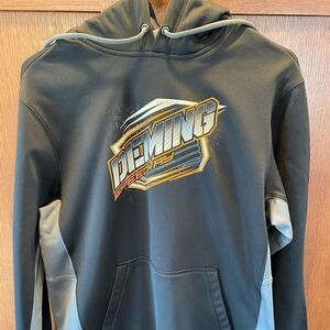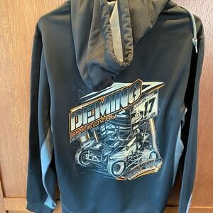 Sport-Tek Hooded Sweetheart with logo of Deming Speedway in Deming, Washington. This sweatshirt is in like new condition and is black and gray with really nice graphics.