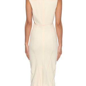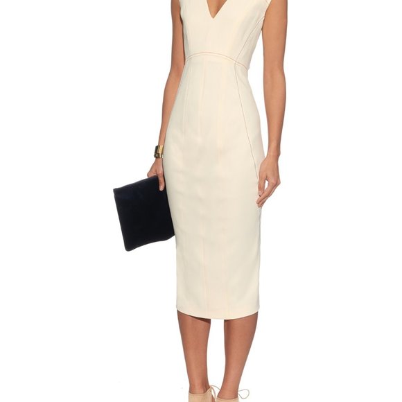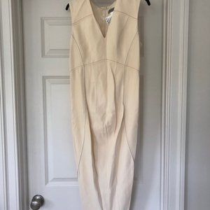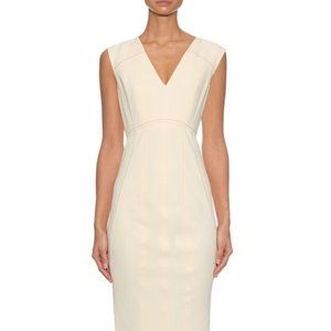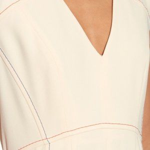 Figure-defining dress with seams. Midi length. Cream colored, cady material. V-neck, sleeveless. Center back slit. Center back concealed zipper. Contrasting red and navy topstitching. Cream crepe top lining. 52% acetate, 45% viscose, 3% elastane. Lining: 65% viscose, 35% polyester. Dry clean.