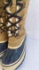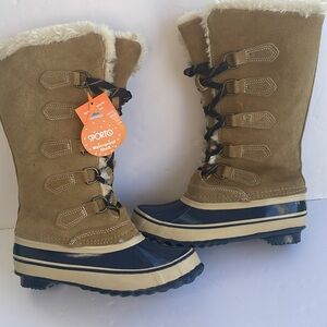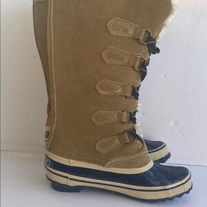 Stylish and warm winter boots. Tan suede upper with navy blue rubber sole. Perfect for cold weather.
