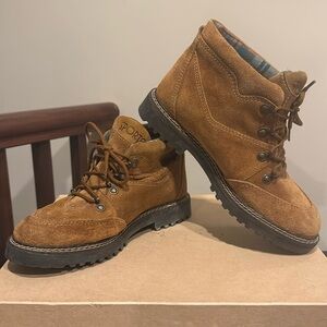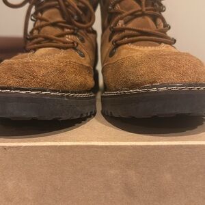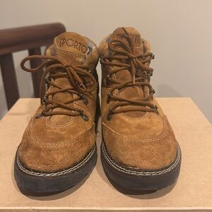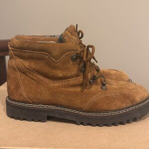 Very gently preowned. Genuine leather/suede upper lace up the front with metal grommets. There are a couple of tiny spots. I’ve shown them in the photos.