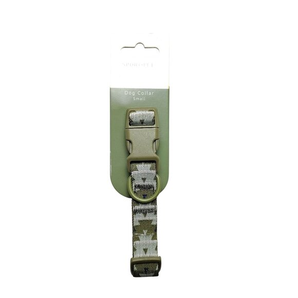 This high-quality medium-sized dog collar boasts a rugged green camo design, blending style and functionality. Crafted by Sportpet Living, it features an adjustable strap for a perfect fit and a secure plastic buckle. Ideal for medium-sized dogs, it combines durability and aesthetic appeal, making every walk a statement of taste.