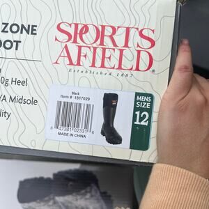 Get ready for your next outdoor adventure with these Sports Afield Premium Zone rubber fishing and hunting boots! These boots are brand new in the box and ready to keep your feet dry and comfortable. They are black, size 12 and perfect for any fishing or hunting trip.