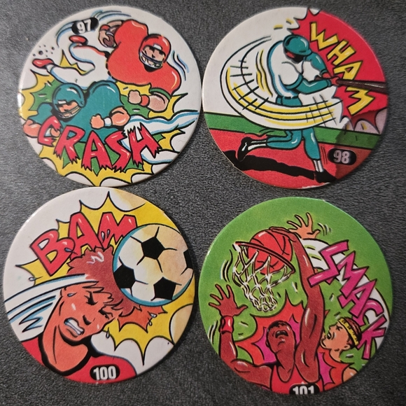 Set of 4 sports themed pogs- in used condition. Two of the pogs are miscolored, as shown, in otherwise great condition.