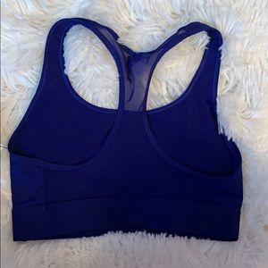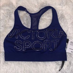 Royal blue sports bra with “Victoria’s Sport” in silver glitter on the front