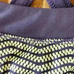 Racerback straps. Lined, light padding. Polyester and spandex.