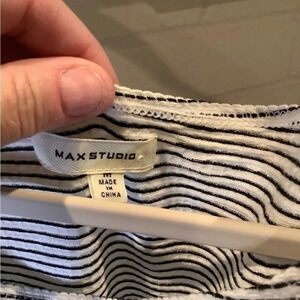 This is a super soft, max studio, black and white side ruched dress. Shoulders also have rushed sleeves for a flattering style. This dress is a size medium and the chest measures 17 inches and 40 inches from under arm to bottom of dress. Such a cute summer staple.