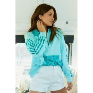 Sporty Spice Sequin Striped Henley Sweatshirt in Aqua
