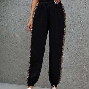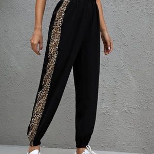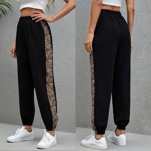 Sporty black contrast leopard side seam elastic high waist tapered pants.
