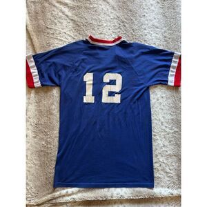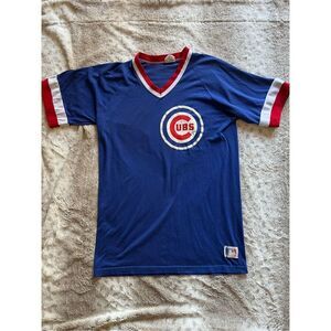 Vintage jersey-style v-neck top with Cubs logo. Item is size L and is soft cotton in texture with jersey texture on neck and sleeve trim.