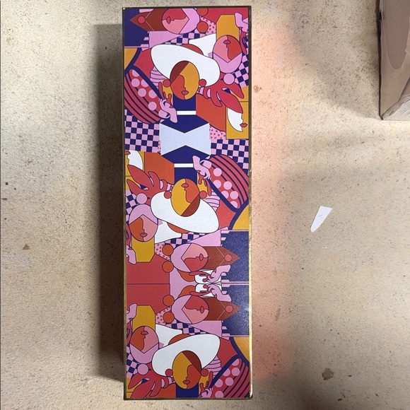 Vibrant box with abstract patterns in pink, orange, and blue.