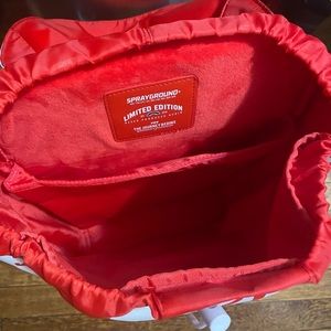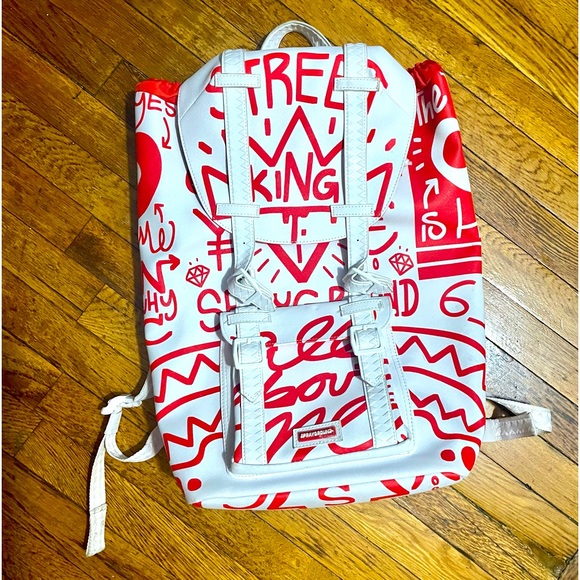 Sprayground backpack. red and white color. deep bag to fit lots of things and a laptop space as well. Vegan leather and waterproof
