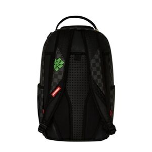 Dimensions: 18" x 6" x 11.5" • Front zipper pocket • Side pockets • Zippered Stash pocket • Separate velour sunglass compartment • Ergonomic mesh back padding • Adjustable Straps for custom sizing • Gold zippers with metal hardware • Metal "Sprayground Authentic" badge • Slide through back sleeve connects to carry-on luggage to free your hands
