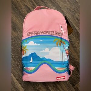 Backpack by Sprayground in pastel pink featuring a vibrant beach scene graphic with ocean, mountains, palm trees, and rainbow wave detail. “Sprayground” logo printed on the front with signature red badge at the base. Made of durable water-resistant fabric, includes a main zip compartment and vertical front zip pocket. Lightweight and perfect for daily use. Condition: excellent, no visible flaws