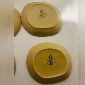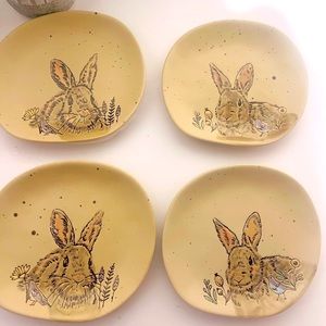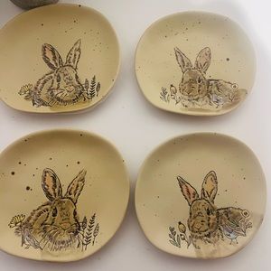 Plates can be used for other side dishes. Embossed bunnies, flowers and birds with different colors in a tan background with small brown specks, like brown eggs-gorgeous
