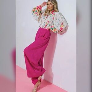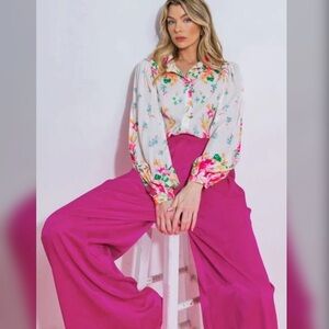 Update your wardrobe with the Spring Bloom Top. This floral-printed woven top boasts vibrant flowers and is made of 100% polyester for a comfortable fit. The collared button down and pleated, cuffed sleeves add a touch of elegance. This top pairs beautifully with jeans, trousers, and skirts for a versatile and stylish look; it's perfect for both work or play. Be bold this spring with the Spring Bloom Top.