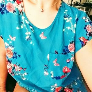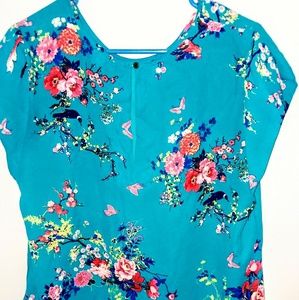This light material is a short sleeve blouse embellished with a pocket. This is a gorgeous blue blouse printed with flowers and cute little birds. The size is an Xl but fits like a Large.