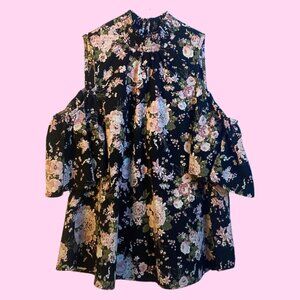 This Black & Pink Floral Cold Shoulder High Neckline Blouse is in excellent condition!