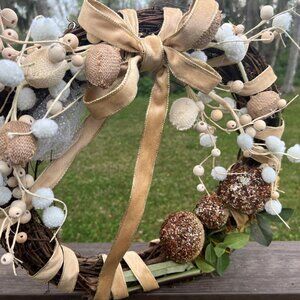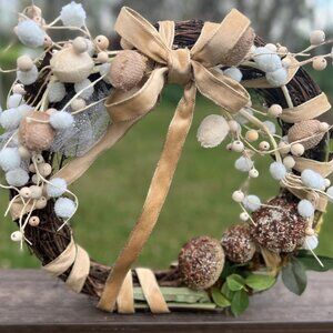Bring the beauty of spring indoors with this delightful 17" wreath. Adorned with burlap eggs, sparkling glitter mushrooms, and a natural earth-tone color scheme, it adds a touch of rustic charm to your home décor. Complete with a coordinating ribbon for easy hanging.