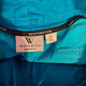 Teal colored Women’s Capri pants. Modern fit. Faux packets on the butt.