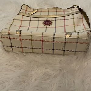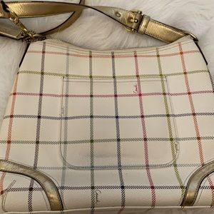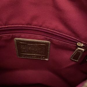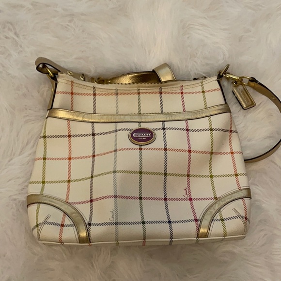 Cute spring colored Coach purse. Used condition, wear on strap and some minor discoloration on backside of bag as shown in photos.
