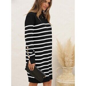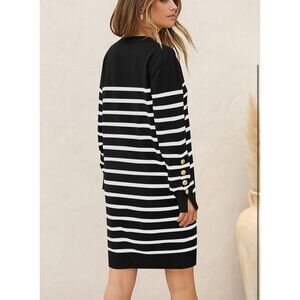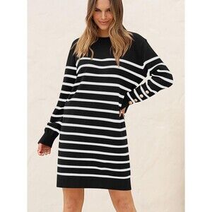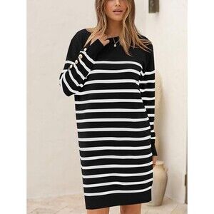 Spring Crewneck Long Sleeve Pullover Sweater dress Casual Cute black striped S