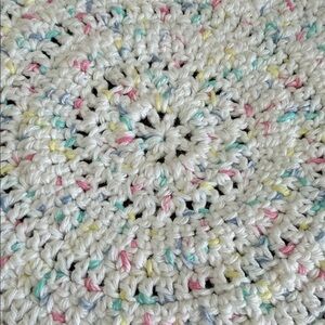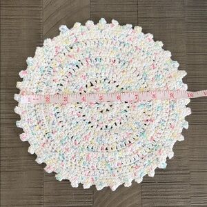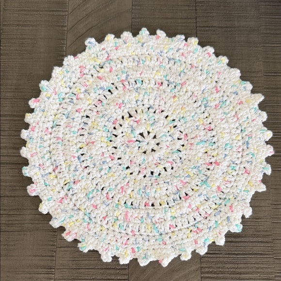 Beautiful round crochet doily in spring/Easter colors. (White, yellow, pink, green, purplish blue) Perfect for adding a touch of color to your spring/easter decor. No stains. Handmade item, may not be perfect.