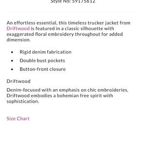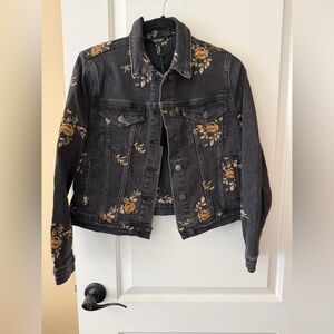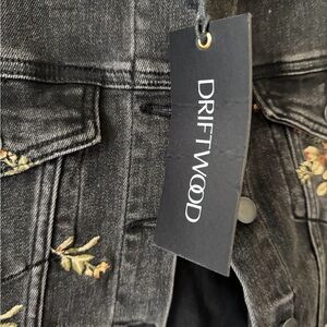 Driftwood brand denim jacket. Black denim with embroidered flowers.
