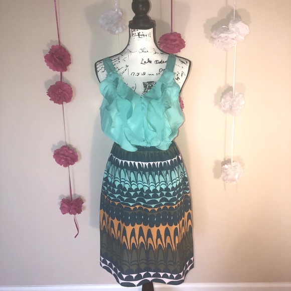 Spring Forward with this light- weight 100% polyester teal, blue, hunter green, and pop of bronze knee length dress. The bodice is draped with teal loose wave ruffles. This a pull over elastic waistband dress. Perfect for a day on the go pair with cute flats, wedges, or heels. Oh and accessories of course!