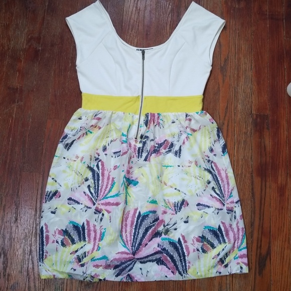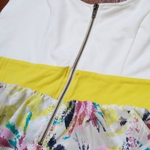 Cute & colorful dress. Bronze colored zipper up the front. Top is very stretchy, but the skirt part is not stretchy at all. The skirt I'd also lined. Bottom has no hem.